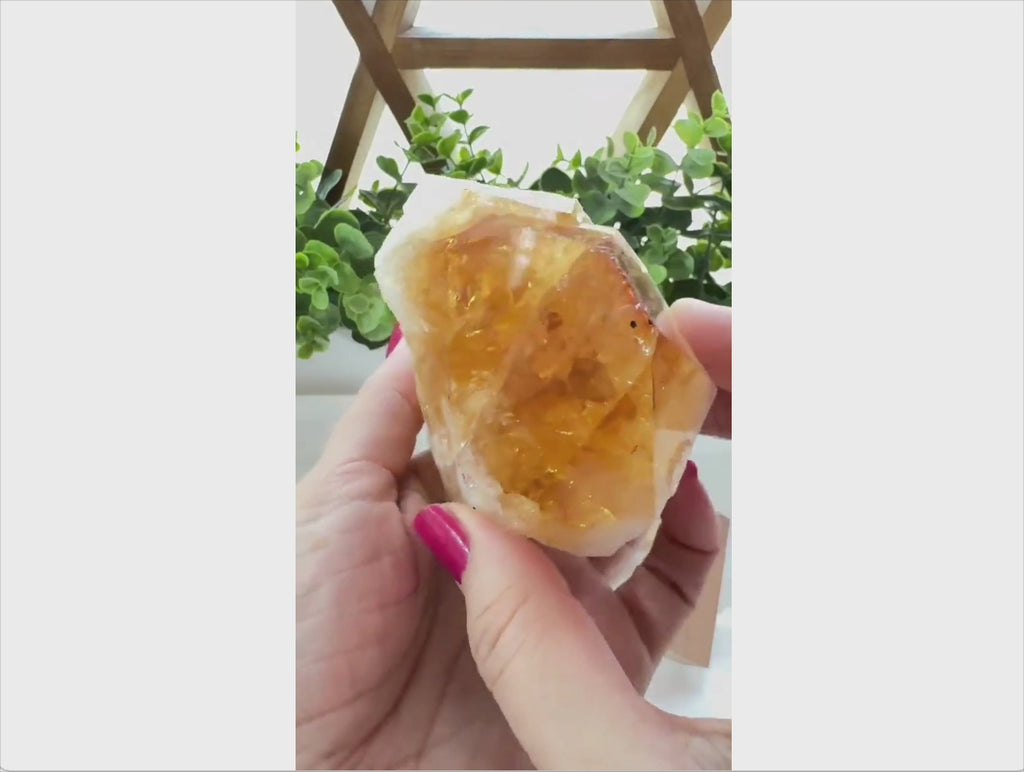 Gorgeously sparkly and vibrant, this raw citrine point with hollandite inclusion is so much prettier in person. This is a naturally formed crystal that has been heated to amplify its color. And it is stunning. All these photos are taken in natural light, and you can see how it sparkles with huge rainbow inclusions and a beautiful brilliant energy. I even spotted a rainbow inside. This is a very special piece.